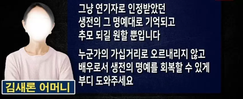 金賽綸的母親透過《橫豎研究所》表示,之所以再次提起已故的女兒,是因為她的名譽因假新聞一瞬間被摧毀,希望能還她一個公道。她強調,並非想挑起紛爭,而是希望金賽綸能以生前的榮譽被記住和悼念,而不是淪為他人茶餘飯後的話題。